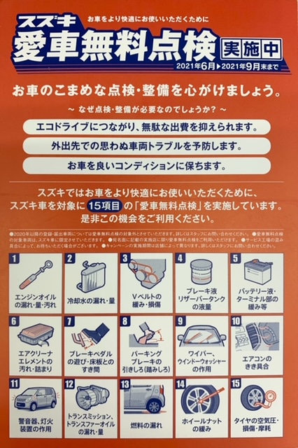 2021.6~2021.9月末まで スズキの愛車無料点検が始まります! 安心の15項目!この機会に是非ご来店ください♪ ※ご予約制となります。 <ご予約はこちら> お電話でも承ります。 ☎0192-27-5101