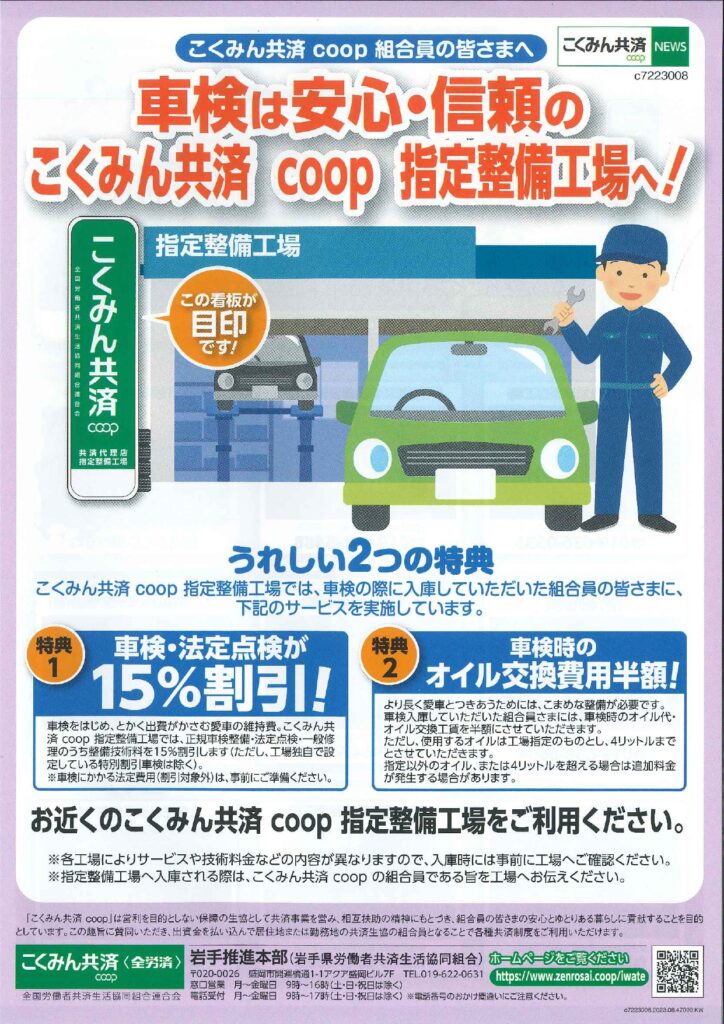 当店ではこくみん共済coop組合員の方の車検も承っております!